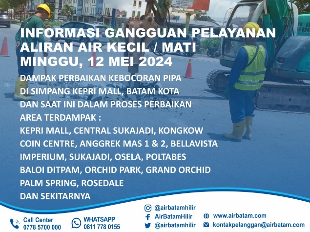 BATAM – Air Batam Hilir menginformasikan dampak perbaikan kebocoran pipa di Simpang Kepri Mall, Batam Kota dan saat ini perbaikan masih dalam proses.