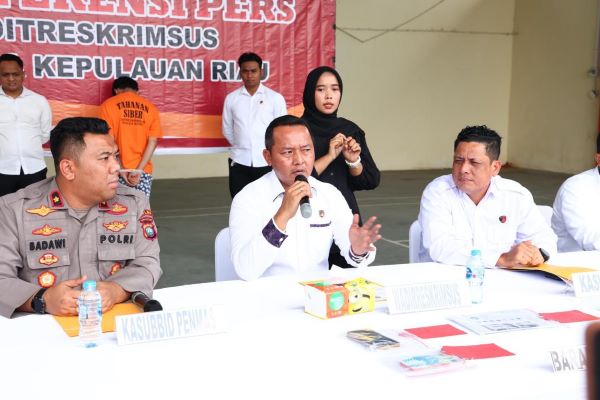 Konferensi pers yang digelar di Hanggar Cakra Buana Samapta Polda Kepri, Senin (15/7/2024), dipimpin langsung oleh Wadirreskrimsus Polda Kepri, AKBP Ade Kuncoro Ridwan.