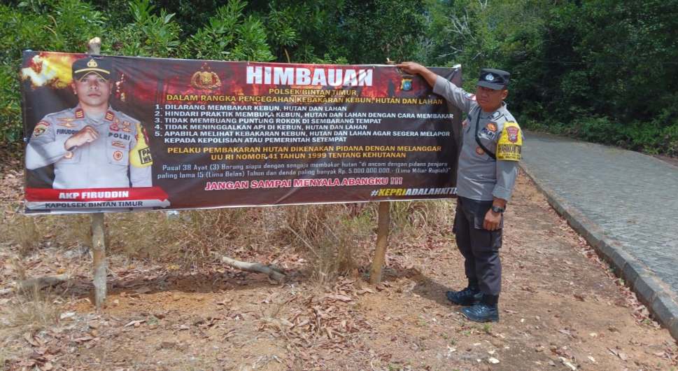 WARTAKEPRI.co.id, BINTAN – Untuk mencegah kebakaran hutan dan lahan di wilayah hukum Polres Bintan, Polsek Bintan Timur, Komandan Kapolsubsektor Bintan Pesisir melalui Bhabinkamtibmas Desa Kelong pasang Spanduk Karhutla di sepanjang hutan dan lahan di Desa Kelong.