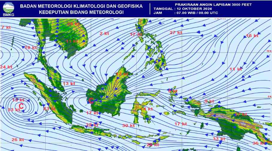 Secara umum, kombinasi fenomena-fenomena cuaca tersebut diprakirakan menimbulkanpotensi cuaca signifikan dalam periode 11 – 17 Oktober 2024, berupa: Potensi Hujan sedang – lebat yang dapat disertai kilat/petir dan angin kencang Potensi Angin Kencang
