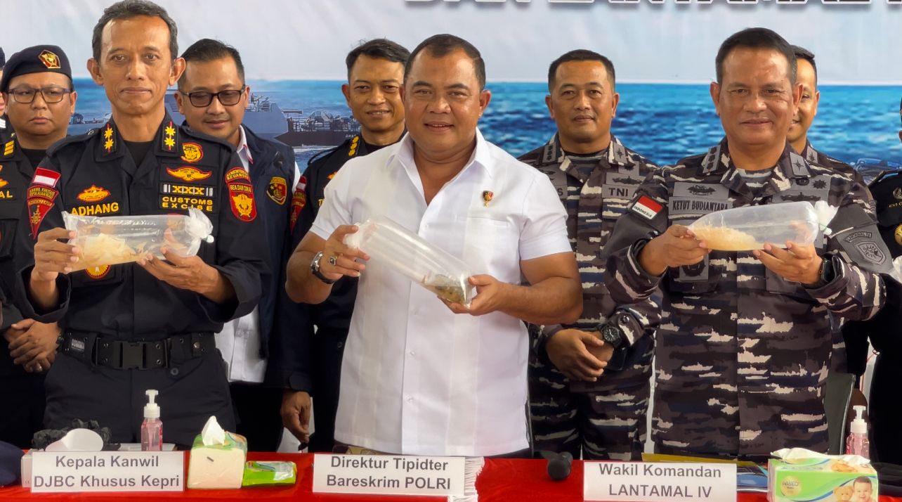 Hal tersebut diungkapkan oleh Direktur Tipidter Bareskrim Mabes Polri, Brigjen Pol Nunung Syaifuddin, saat menggelar konferensi pers penegahan penyelundupan Benih Bening Lobster (BBL) oleh tim gabungan Kanwil DJBC Khusus Kepri, Bareskrim Polri serta Lantamal IV, Kamis 17 Oktober 2024, di Pos Gurita, Kanwil DJBC Khusus Kepri.