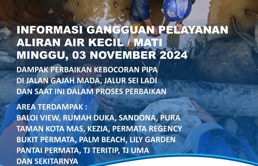 BATAM – Air Batam Hilir menginformasikan dampak perbaikan kebocoran pipa DN 300mm di Jalan Gajah Mada, Jalur Sei Ladi dan saat ini perbaikan masih dalam proses.
