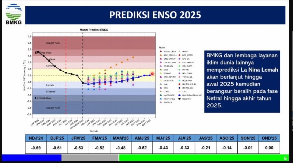 Kepala BMKG Dwikorita Karnawati menyampaikan bahwa sepanjang tahun 2025 tidak akan terjadi anomali iklim. Hal ini dikarenakan ENSO (El Nino-Southern Oscillation) dan IOD (Indian Ocean Dipole) berada dalam kondisi netral sepanjang tahun 2025. Adapun kondisi La Nina lemah diprediksi akan terus terjadi hingga awal tahun 2025.