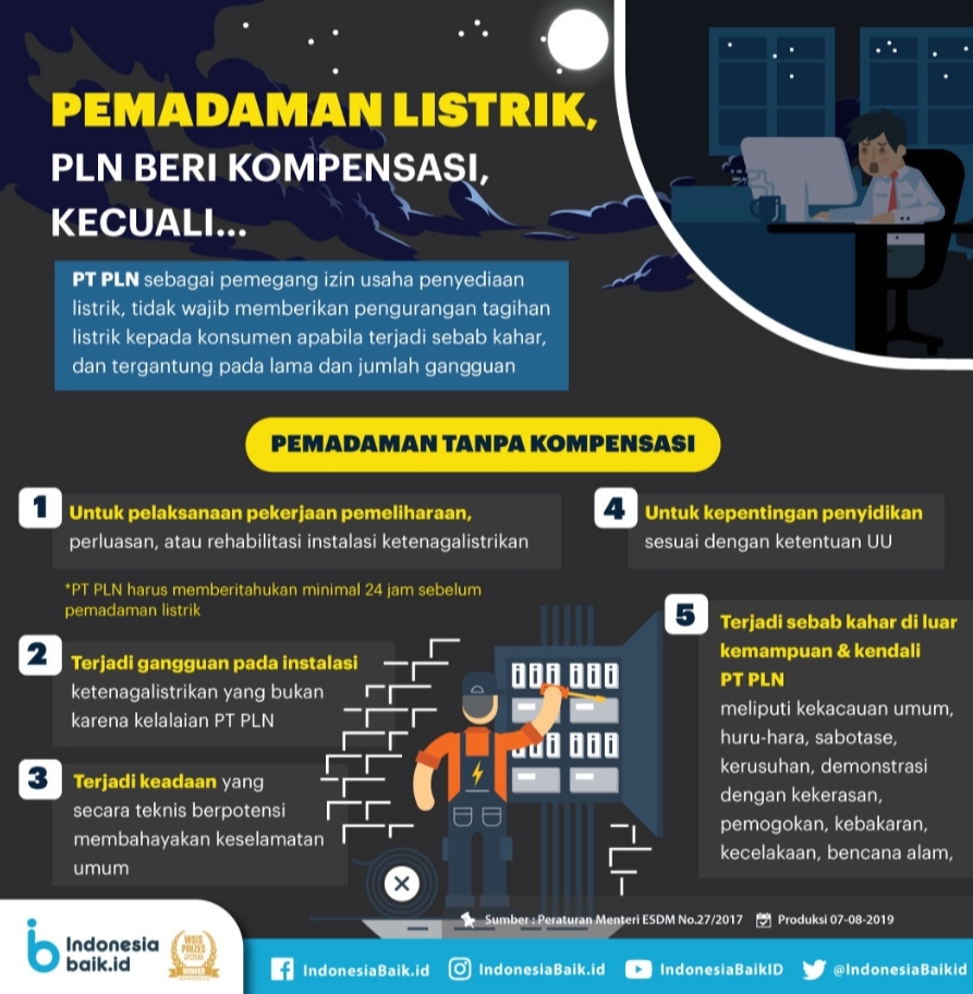 Ketentuan mengenai kompensasi kepada konsumen yang dirugikan saat terjadi pemadaman listrik sudah diatur dalam Peraturan Menteri Energi dan Sumber Daya Mineral (ESDM) Nomor 27 Tahun 2017.