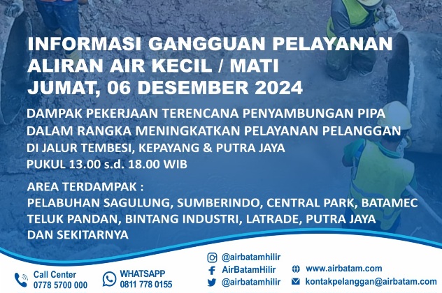 WARTAKEPRI.co.id – Batam Hilir menginformasikan, dampak pekerjaan terencana penyambungan pipa dalam rangka meningkatkan pelayanan pelanggan di Jalur Tembesi, Kepayang dan Putra Jaya, yang akan dilakukan pada :