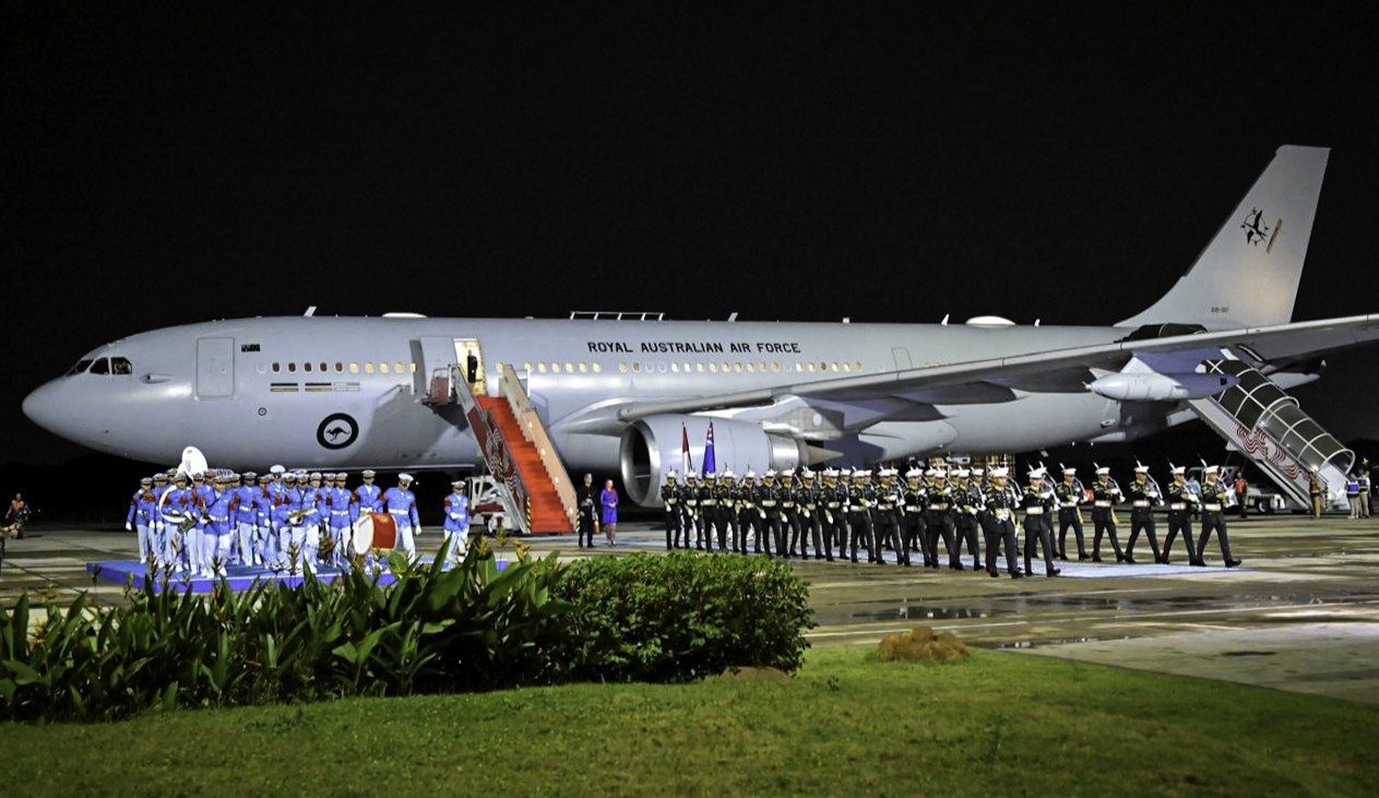 Setibanya di Pangkalan TNI AU Halim Perdanakusuma, Jakarta, PM Albanese disambut pasukan kehormatan yang telah berjajar di bawah tangga pesawat untuk memberikan penghormatan resmi.