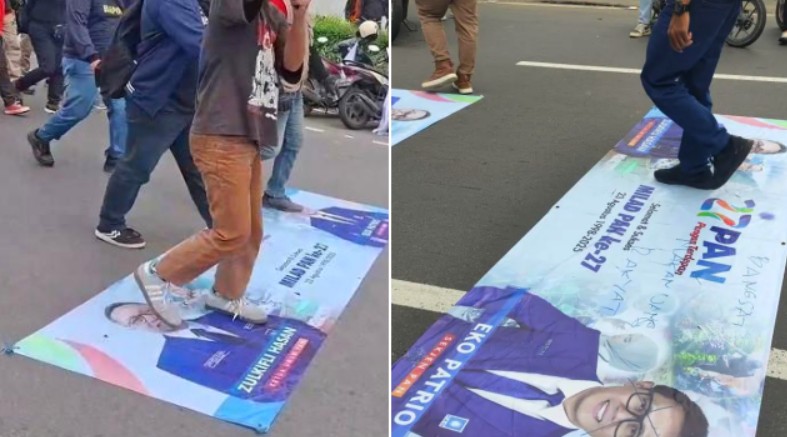 Dua spanduk bergambar Zulhas dan Eko Patrio digelar di atas aspal Jalan Gatot Subroto, dekat Jembatan Penyeberangan Orang (JPO) yang ada di depan Gerbang Utama Gedung DPR. kemudian poster itu diinjak oleh para demonstran.