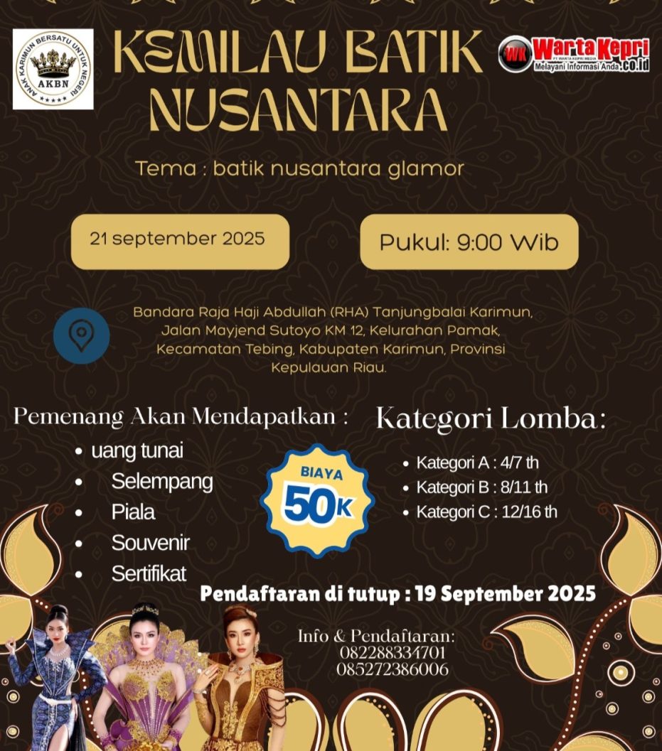 Kegiatan bertajuk “Kemilau Batik Nusantara” tersebut dilaksanakan pada Minggu, 21 September 2025 mendatang, di Bandara RHA, yang beralamat Jalan Mayjen Sutoyo KM 12, Kelurahan Pamak, Kecamatan Tebing, Kabupaten Karimun, Kepulauan Riau.