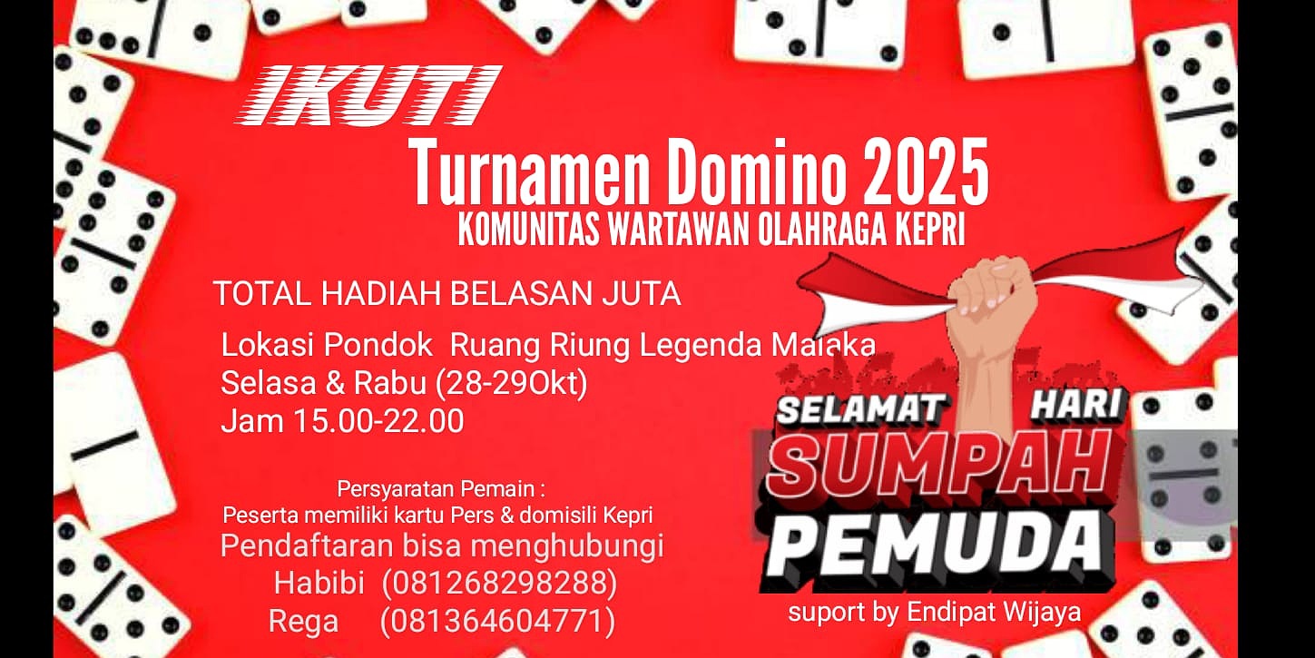 BATAM – Bersempena dengan Hari Sumpah Pemuda, Komunitas Wartawan Olahraga Kepri (K-Work) akan menggelar Turnamen Domino 2025 pada 28–29 Oktober 2025 di Warung Sunda Ruang Riung, Pasar Mega Legenda, Batam Center mulai pukul 15.00 hingga 22.00 WIB.