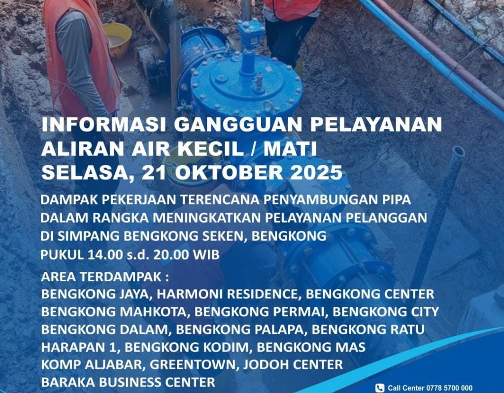 Area terdampak : Bengkog Jaya, Harmoni Residence, Bengkong Center, Bengkong Mahkota, Bengkong Permai, Bengkong Dalam, Bengkong City, Bengkong Palapa, Bengkong Ratu, Bengkong Harapan 1, Bengkong Kodim, Bengkong Mas, Komp Aljabar, Greentown, Baraka Business Center, Jodoh Center dan Sekitarnya.
