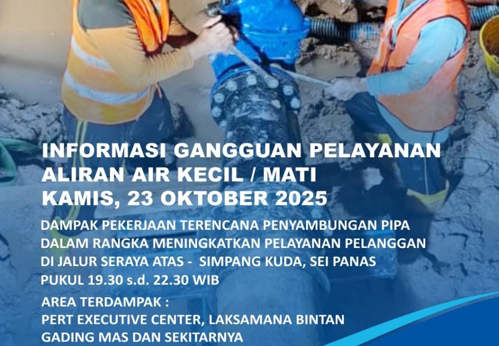 Air Batam Hilir menginformasikan, pelaksanaan pekerjaan terencana Penyambungan Pipa 150mm di Jalur Seraya Atas – Simpang Kuda, Sei Panas yang bertujuan untuk meningkatkan suplai pelanggan dan akan dilakukan pada :