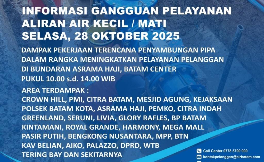 Air Batam Hilir menginformasikan, pelaksanaan pekerjaan terencana Penyambungan Pipa 100mm di Bundaran Asrama Haji, Batam Center yang bertujuan untuk meningkatkan suplai pelanggan dan akan dilakukan pada :