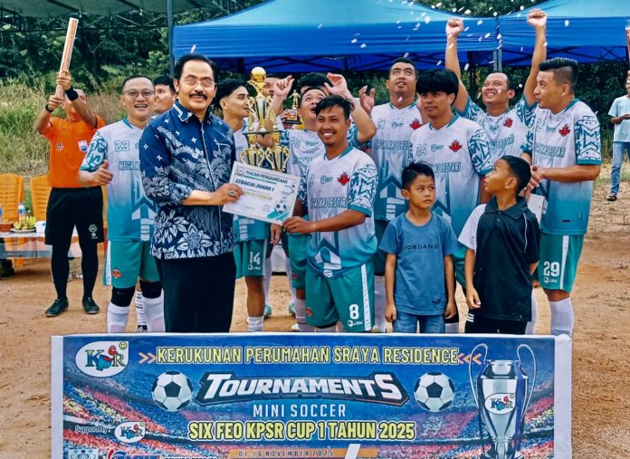 WARTAKEPRI.co.id, KARIMUN – Tim MML Legend FC keluar sebagai juara pertama, setelah menyingkirkan Tim Guardia FC pada posisi kedua dengan skor tipis 2-1 pada Turnamen Mini Soccer Six Feo Kerukunan Pemuda Sraya Residence (KPSR) Cup I Tahun 2025, Minggu, 16 November 2025.