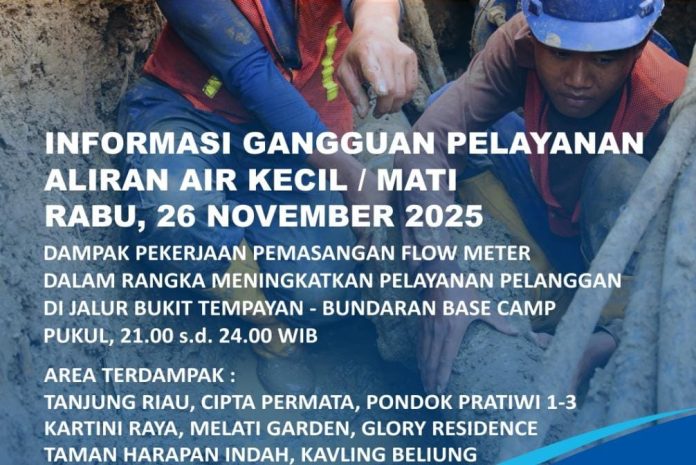 WARTAKEPRI.co.id – Air Batam Hilir menginformasikan, pelaksanaan pekerjaan terencana Pemasangan Flow Meter DN 300mm di Jalur Bukit Tempayan – Bundaran Base Camp, Batu Aji dan akan dilakukan pada :