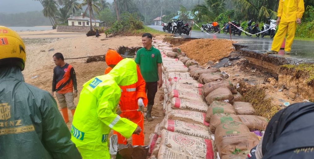 Kegiatan yang dimulai sejak pukul 07.30 WIB tersebut merupakan respons cepat terhadap kerusakan ruas jalan akibat abrasi pantai yang berpotensi mengganggu keselamatan pengguna jalan serta aktivitas sosial dan ekonomi masyarakat.