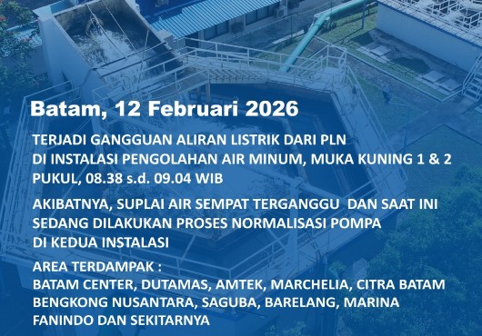 BATAM – Manajeman Air Batam Hilir menginformasikan, dampak gangguan aliran listrik dari PLN di Instalasi Pengolahan Air Minum Muka Kuning 1 & 2