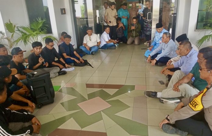 Momen tak biasa terjadi saat Wakil Bupati Karimun, Rocky Marciano Bawole memilih duduk bersila di teras Kantor Bupati untuk mendengarkan langsung aspirasi para demonstran.