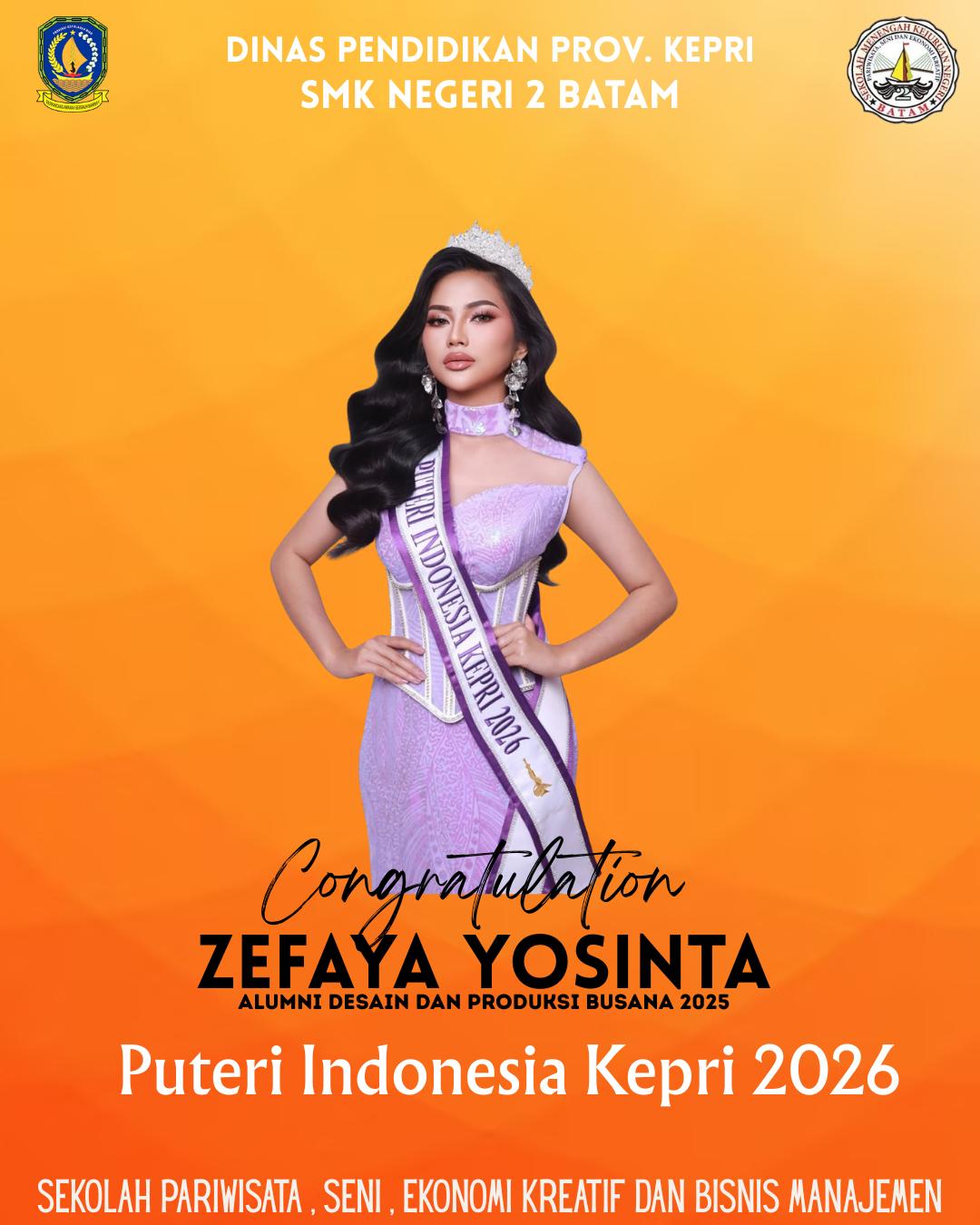 Dan, satu nama yang membangkan bagi Sekolah dan Alumni SMK Negeri 2 Batam adalah Zefanya Yosinta, Puteri Indonesia Kepulauan Riau 2026. Ia dinyatakan berhak berkompetisi pada Puteri Indonesia 2026 mewakili daerah asalnya Batam Provinsi Kepri.